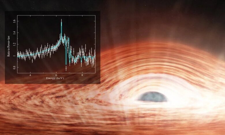 تم اكتشاف خط انبعاث حديدي مشوه للغاية في طيف الأشعة السينية. تنشأ مثل هذه التشوهات بسبب الجاذبية الشديدة والدوران السريع للمادة في القرص التراكمي. وكما يوضح العلماء، فإن هذا يشبه كيفية تغير صوت صفارة الإنذار بسبب تأثير دوبلر، فقط دور “المصدر المتحرك” هو غاز ساخن يدور بسرعة الضوء تقريبًا.